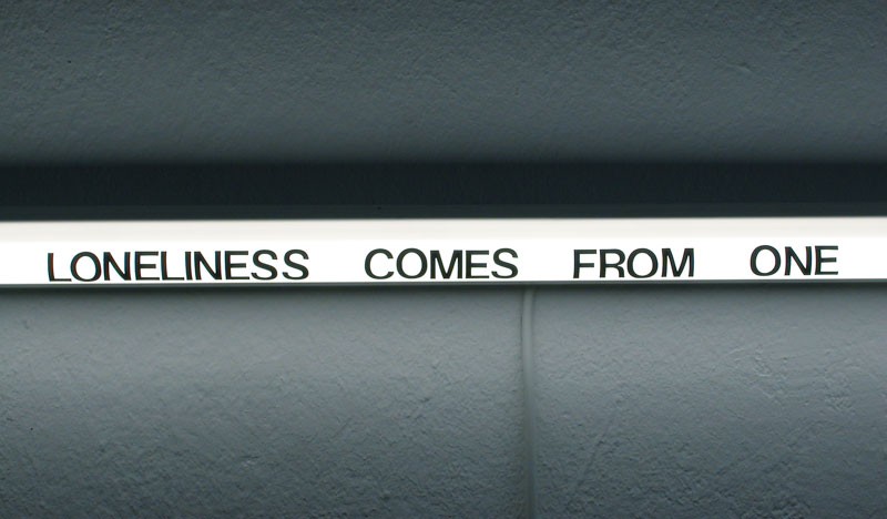 Loneliness comes from one, 2003. Fluorescent light, two raincoats, black lettersets, 196 x 158 cm. (detail)