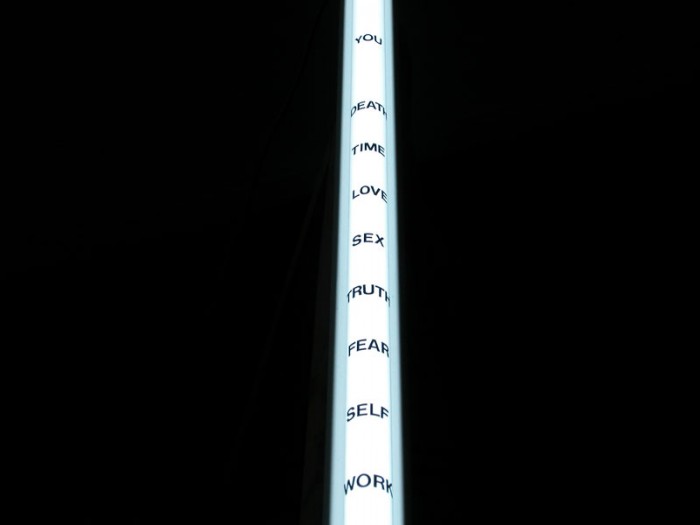 Work table, or able to pick up on the previous year, 2002-2003 2 fluorescent lights, 2 wooden structures, black letterset, 12 VHS tapes. (detail)
