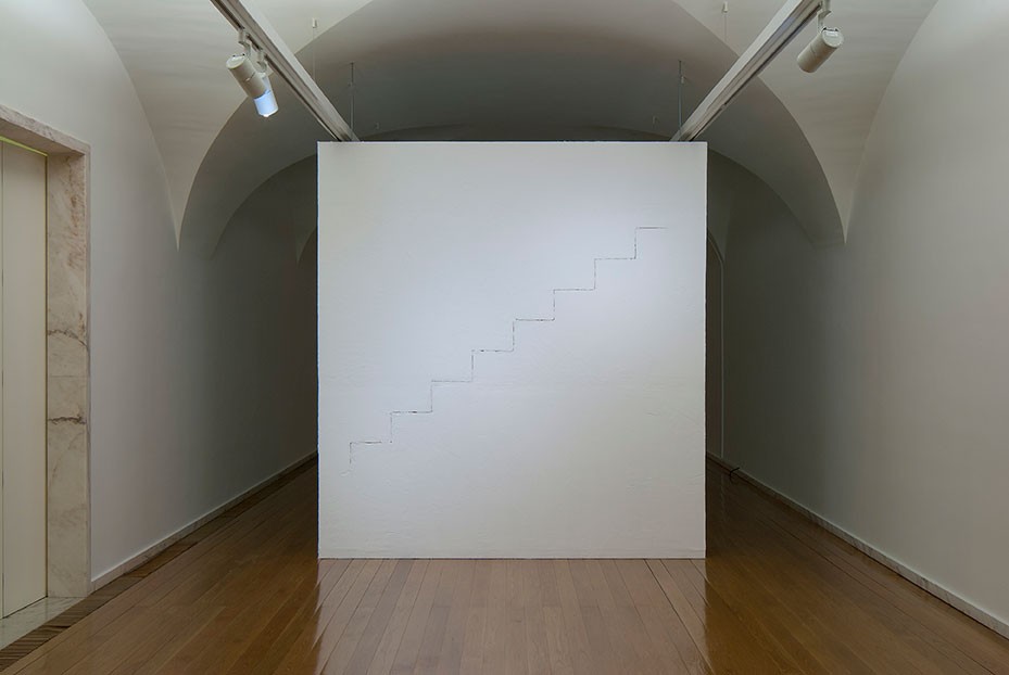 If there is a tendency towards a poetics of images here, it is challenged by 'Ghost' (2014), a sculpture that consists of a wall to which the memory of a staircase still clings, a pre-existence that brings us into contact with human activity, in which the presence of the movement of the body finds its temporal, fragmentary inscription. The sculpture, which materialises somewhere between drawing and installation in the exhibition room, is also a paradoxical place, not only due to its symbolic shift but also because the wall's other side displays the screen in which the video 'Passagem de nível' (2014) is shown. The rapport between these urban situations and what we may call small everyday 'accidents' (some of them caused by natural phenomena), which we incorporate into our life experience, combines with a secret movement of the city that puts us back in contact with a romantic vision, in which a visual murmur mingles with a sound construction that envelops the viewer in the work's intermittent narrative.