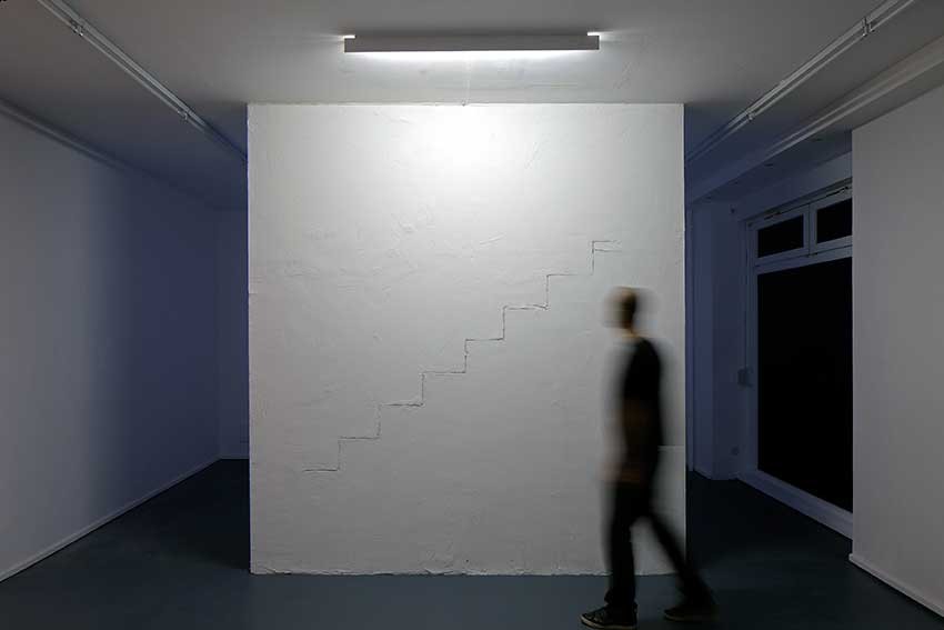 The sculpture Level crossing that was built in the gallery’s space is itself an instance of the artist’s contradictory approach. The marks on the wall indicate that a stairway was once there. These marks, which we may immediately associate with memory, also reveal a moment in time, a duration, as well as a sense of change and transitoriness that is sublimated by that architectural element as it reconnects spaces and various levels of the body’s transit. The opposite side of the sculpture offers to the viewer the projection of a work on video, Another sequence of events. This contradiction between the past and its reconstruction from the fragment and real-time footage is what draws us to use forms of recording and organising memory.