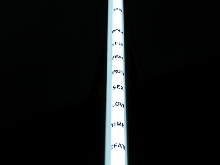 Work table, or able to pick up on the previous year, 2002-2003 2 fluorescent lights, 2 wooden structures, black letterset, 12 VHS tapes. (detail)