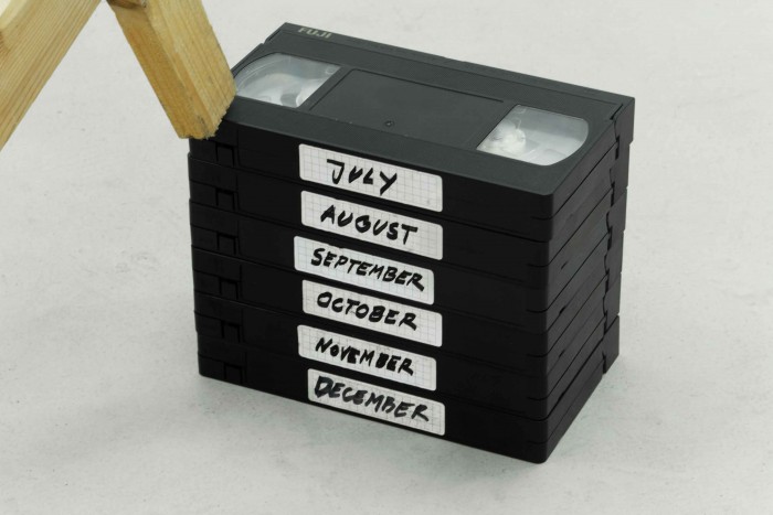Work table, or able to pick up on the previous year, 2002-2003 2 fluorescent lights, 2 wooden structures, black letterset, 12 VHS tapes. (detail)